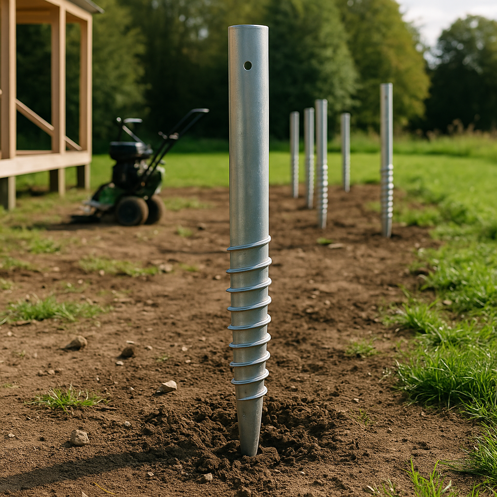 Det er en galvaniseret stålskrue, der skrues direkte ned i jorden ved hjælp af specialværktøj – uden behov for at grave ud, støbe eller vente på tørretid.